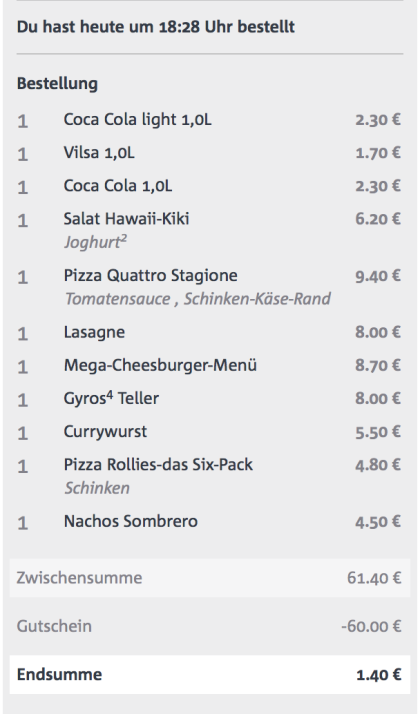 Zur Produktbewertung: Der Salat bot das, was er sein wollte (Eisbergsalat, Schinken, Ananas, Gurke und Käse) und konnte somit auch nicht überraschen. Die eingesetzten Zutaten waren frisch und schmeckten wie erwartet. Die Pizza Quattro Stagione (mit Schinken-Käserand) konnte durch ein lockeren Teig überzeugen. Auch die bestellten Nachos Sombrero kamen als Snack gut an. Besonders hervorheben möchten wir allerdings die Pizza Rollies, diese waren geschmacklich sehr gut. Der Mega-Burger bot sehr viel Masse, war allerdings nicht mehr als ein typischer Imbissburger (quasi wie erwartet). Beim Gyros-Teller machte sich vor der Lieferung Skepsis breit, diese war allerdings völlig unberechtigt. Das Gyros war weder überfettet noch trocken und kann durchaus mit so manchem griechischen Konkurrenten mithalten, hierfür ein großes Daumen hoch! Übrigens waren die Pommes frites für einen Lieferservice echt gut, sie waren nicht labbrig und kamen noch relativ heiß bei uns an.